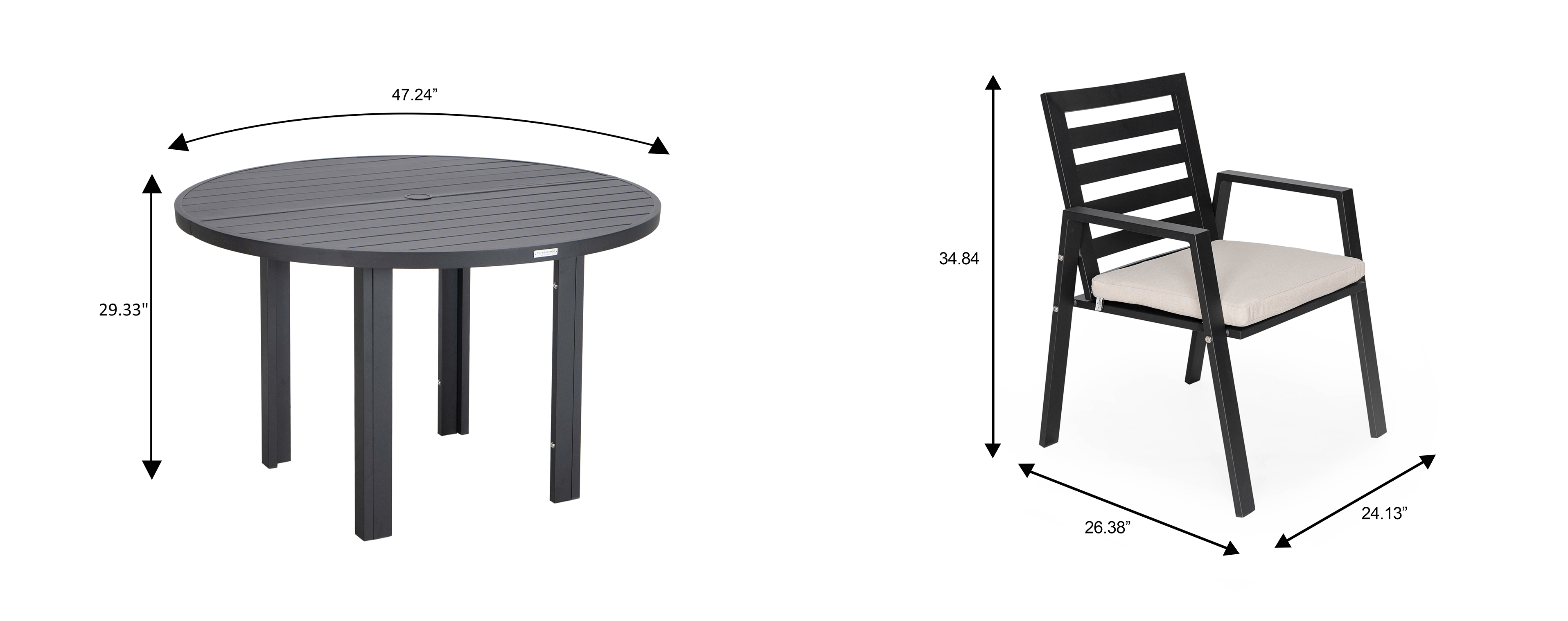 Elevate your patio dining experience with the Chelsea 5-Piece Patio Dining Set! Crafted with a 48" round aluminum dining table and 4 comfortable dining armchairs, this set is perfect for entertaining guests or enjoying alfresco meals with your family. Upgrade your outdoor space with this stylish and durable dining set.