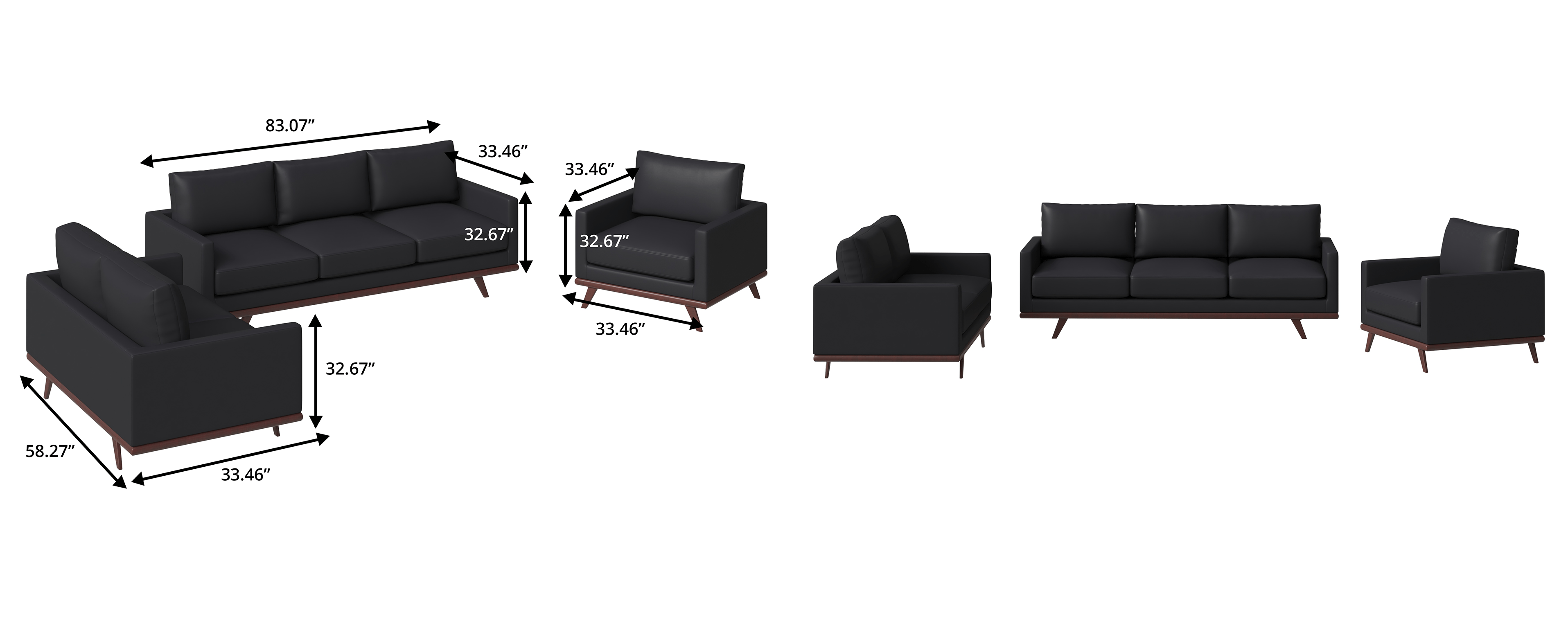 - Overall Width - Side to Side Accent Chair: 33.46 in. Loveseat: 58.67 in. 3 Seater: 83.07 in.
