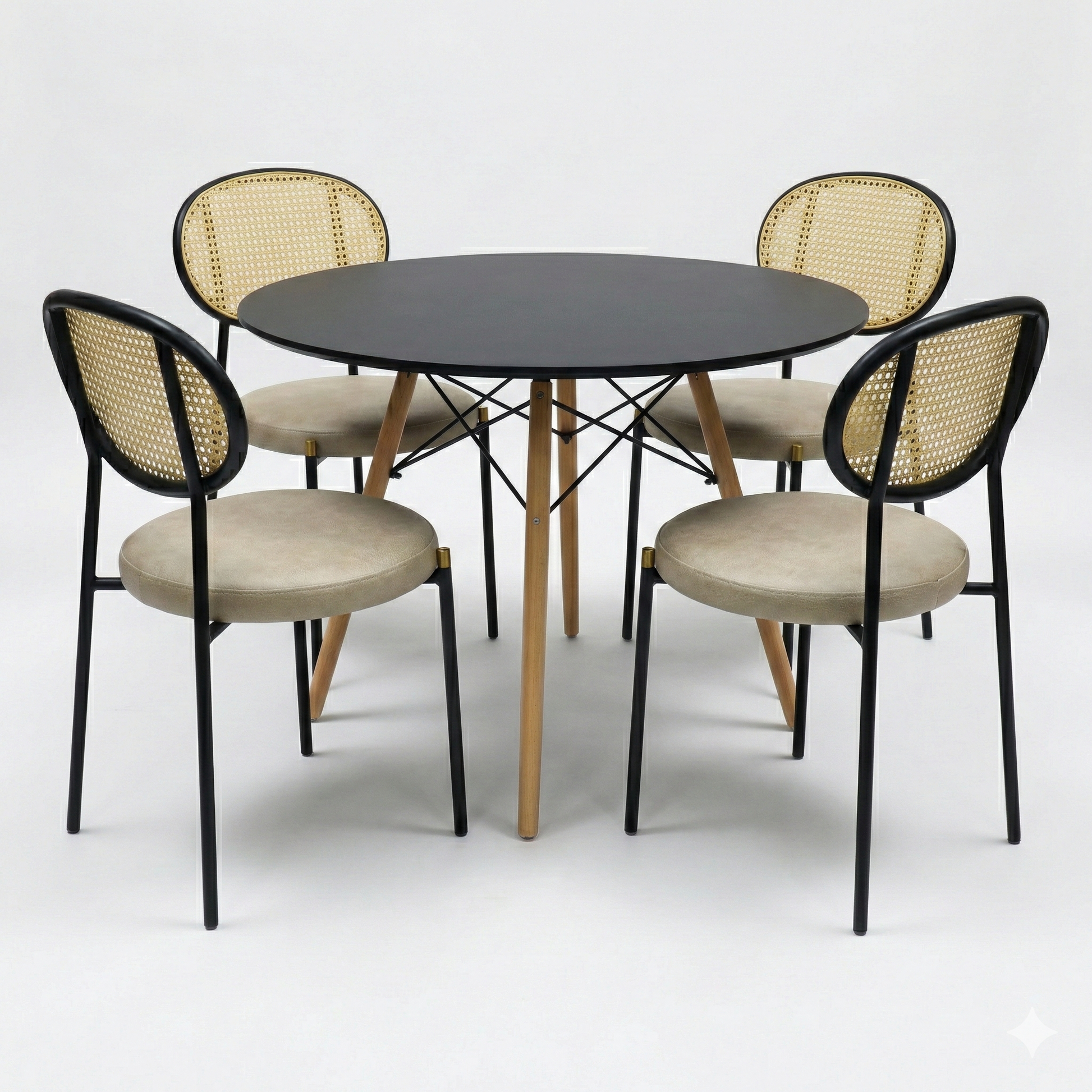- The four chairs have soft velvet or leather upholstery, 6cm thick high-density sponge seat padding, and breathable wicker backrests for both comfort and elegant appearance.