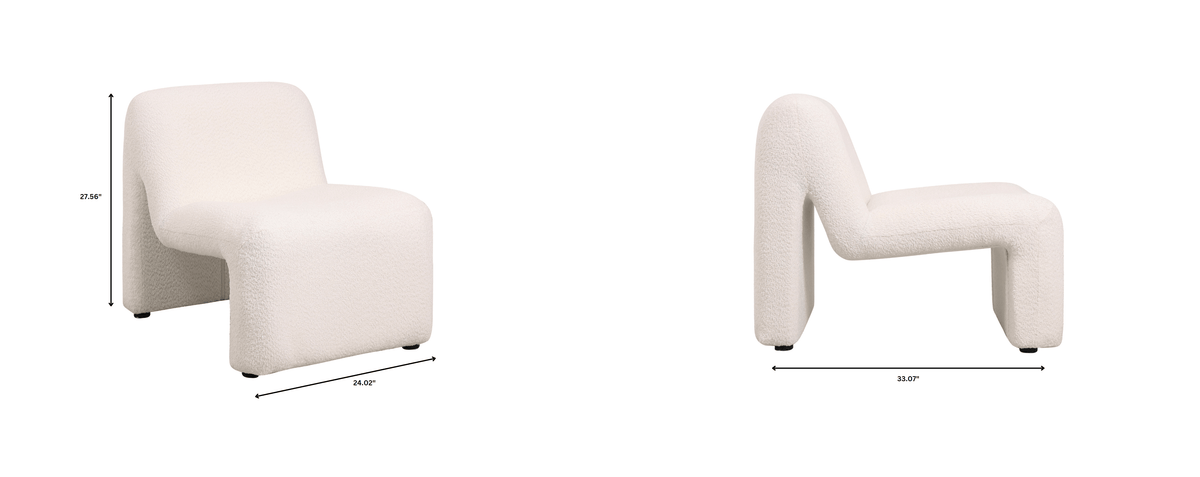 Elevate your space with the Klyx Modern Accent Chair. Its elegant waterfall profile embodies modern luxury, while high-density foam cushions ensure support and relaxation. Durable iron frame and plywood inner support. Choose from plush velvet or textured boucle upholstery. Floor-protecting glides and fully assembled for easy integration.