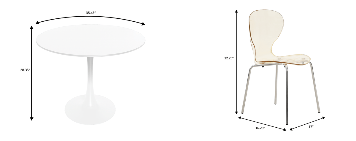 Transform your dining space with the sleek and modern LeisureMod 5-Piece Dining Set. The round white MDF table and 4 acrylic chairs with chrome legs create an elegant and contemporary look. Enjoy dinners with family and friends in style and comfort. Elevate your dining experience with this stylish and functional set.