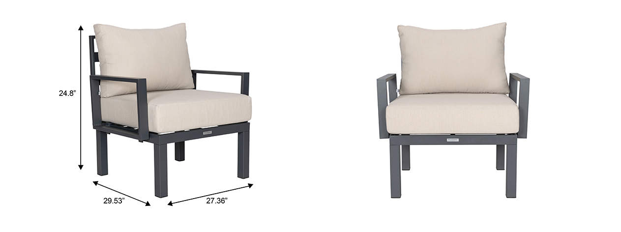 - Crafted with precision, the patio set features a frame constructed from durable aluminum. The powder-coated finish not only enhances its aesthetic appeal but also adds a layer of protection against the elements.