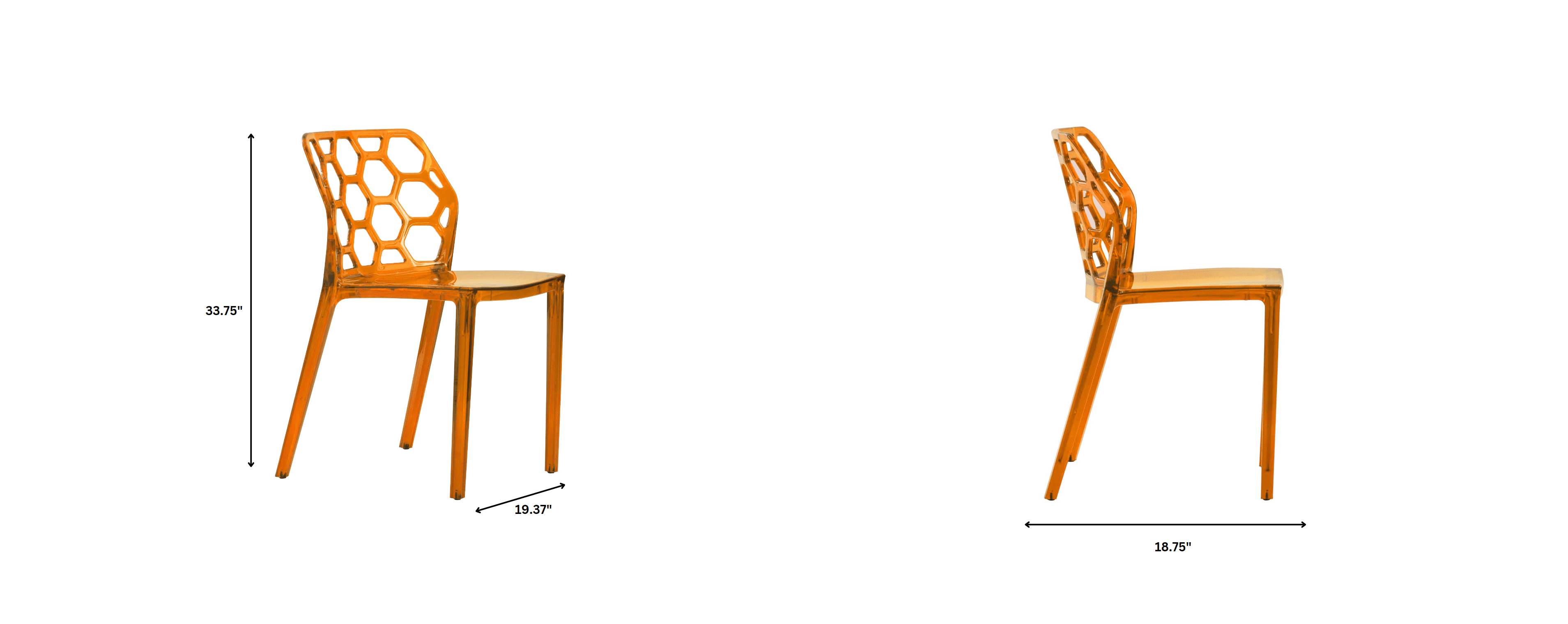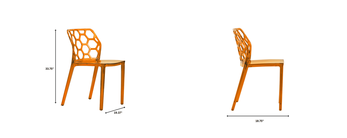 Experience the ultimate in modern dining with the Dynamic Modern Honeycomb Design Dining Side Chair. Featuring a stylish hexagon shape and sturdy acrylic construction, this chair is not only visually appealing but also convenient with its stackable design. Perfect for any space, these chairs also feature non-marking feet for floor protection. No assembly required.
