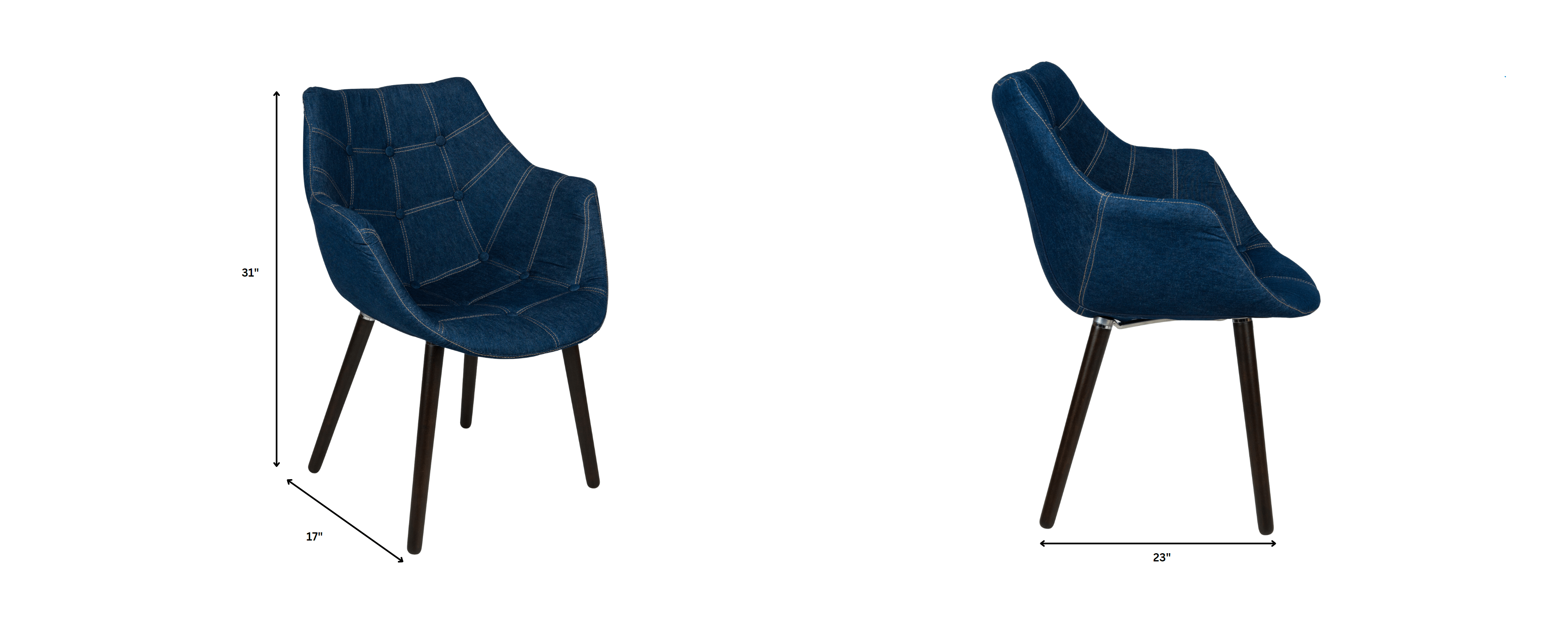 The Milburn Denim Chair combines durability and style with its sturdy plastic shell, soft sponge foam, and fine cotton denim upholstery. Supported by solid beechwood dowel legs finished in dark walnut with metal ring accents, it offers ergonomic comfort and distinctive design for any space.