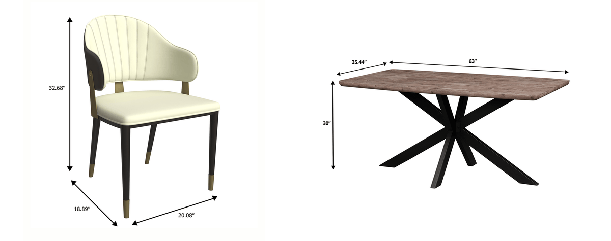 The Ravenna dining set offers a stylish and modern addition to any dining space. The rustic gray MDF top table provides a durable and easy-to-clean surface, while the leather/velvet dining chairs offer a comfortable and luxurious seating experience. Upgrade your dining experience with the Ravenna dining set!