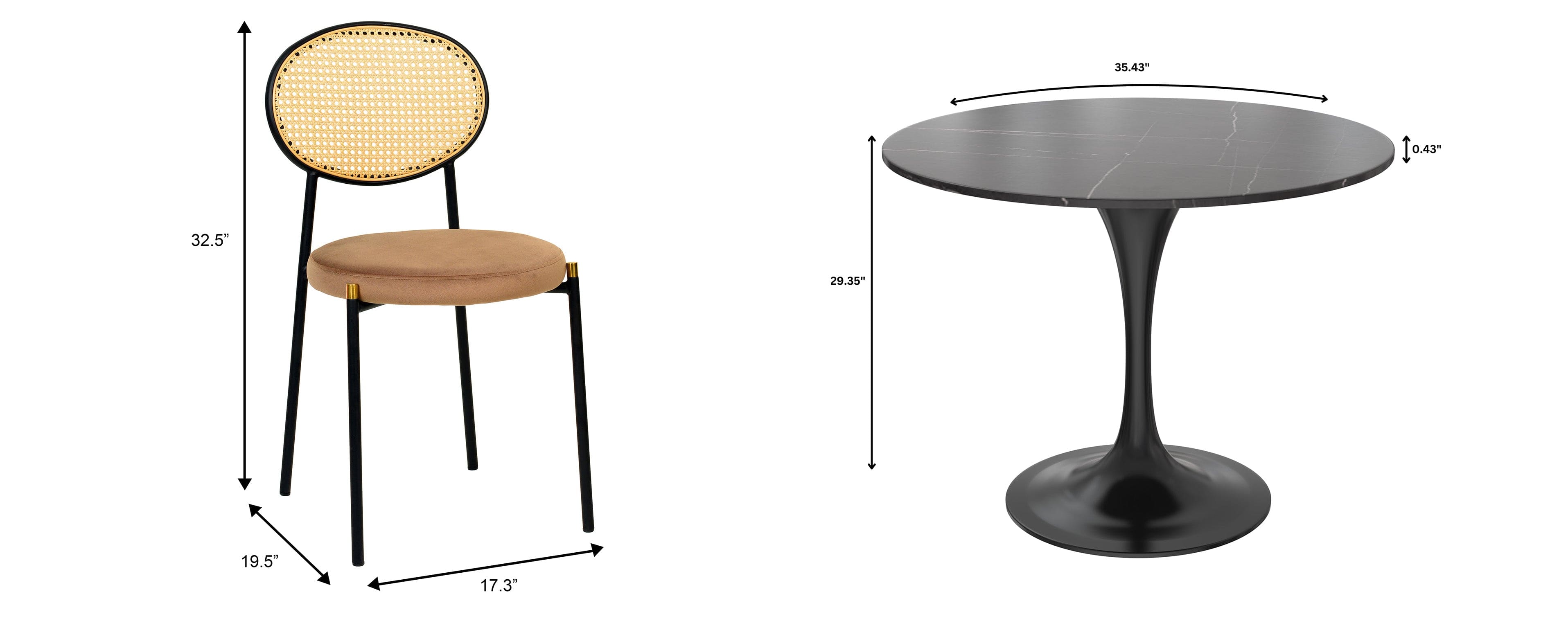 Verve 5-Piece Dining Set with 36" Round Dining Table Black Sintered Stone Top and Black Pedestal with 4 Velvet Dining Chairs